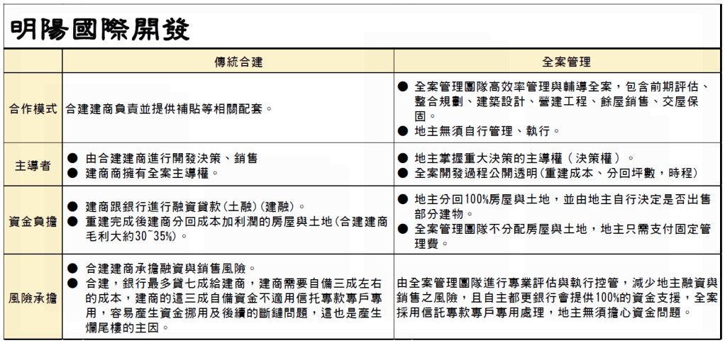 「全案管理」是地主委託專業管理團隊統籌執行全案重建過程的大小事務,並分回全部重建後面積,也就是未來重建後價值全部歸地主所有的方案。相較於「傳統合建」由建商主導,在「全案管理」的架構下,地主為全案資金提供者,故掌握重大事項的「決策權」,像是遴選建築師、選定信託與融資銀行、營造廠發包等等,都將透過明陽團隊提供專業協助,並依照地主決議來執行。明陽團隊在重建過程中扮演可靠的專業顧問角色,使得案件在確保品質下可以如期執行,成功重建。